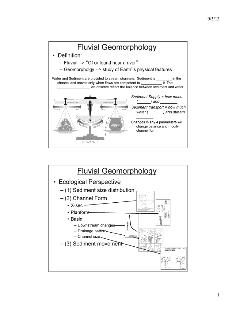 9/3/13 Fluvial Geomorphology Definition: Fluvial Of or found near a river Geomorphology study of Earth s physical features Water and Sediment are provided to stream channels. Sediment is in the channel