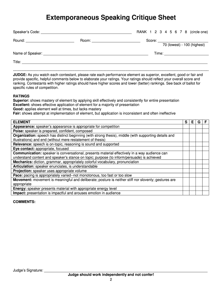 Start by reading the extemporaneous speaking critique sheet carefully.