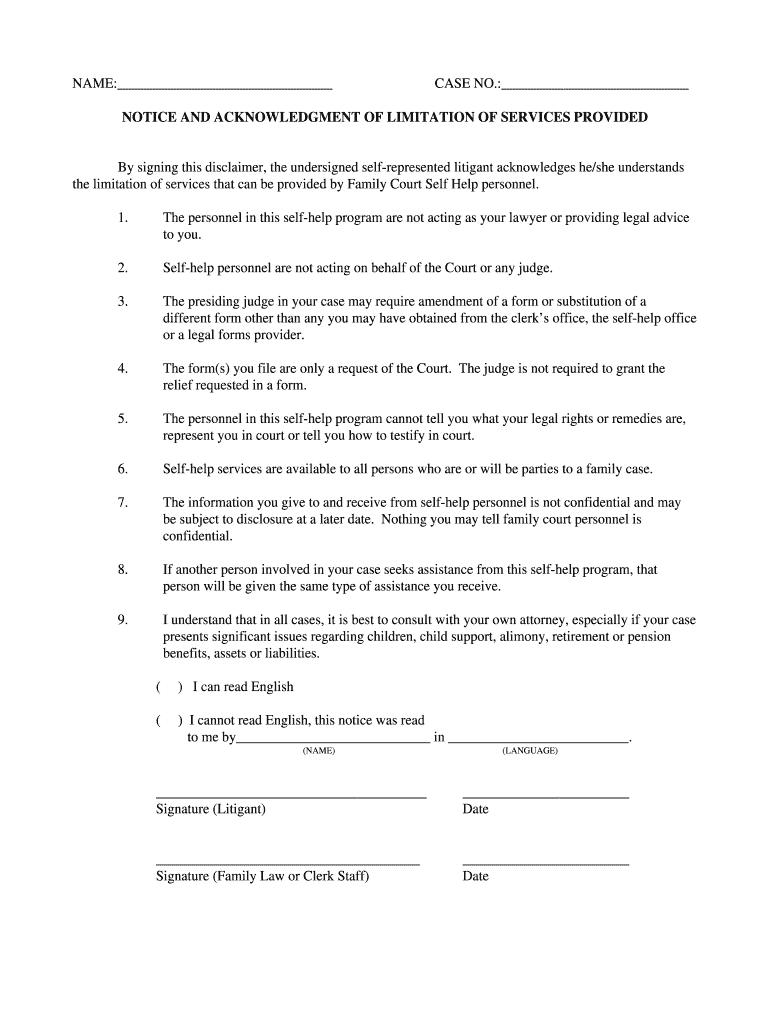 NAME CASE NO. NOTICE AND ACKNOWLEDGMENT OF LIMITATION OF SERVICES PROVIDED By signing this disclaimer the undersigned self-represented litigant acknowledges he/she understands the limitation of services that can be provided by Family Court Self Help personnel. The personnel in this self-help program are not acting as your lawyer or providing legal advice to you. I can read English I cannot read English this notice was read to me by in. NAME LANGUAGE Signature Litigant Date Signature Family...