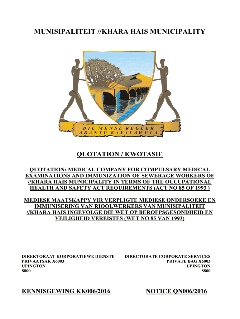 MUNISIPALITEIT //KARA HIS MUNICIPALITY QUOTATION / FOOTSIE QUOTATION: MEDICAL COMPANY FOR COMPULSORY MEDICAL EXAMINATIONS AND IMMUNIZATION OF SEWERAGE WORKERS OF //KARA HIS MUNICIPALITY IN TERMS OF