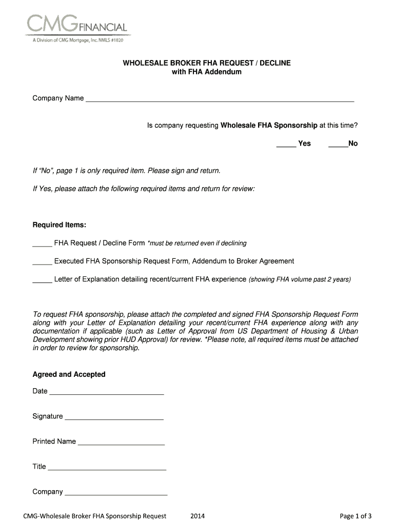 Please note all required items must be attached in order to review for sponsorship. Agreed and Accepted Date Signature Printed Name Title Company CMG Wholesale Broker FHA Sponsorship Request 2014 Page 1 of 3 FHA SPONSORSHIP REQUEST ADDENDUM TO CMG WHOLESALE MORTGAGE BROKER AGREEMENT This Addendum to the Wholesale Mortgage Broker Agreement hereinafter Addendum is made on this day of 20 by and between CMG Mortgage Inc. dba CMG Financial a CA corporation hereinafter CMG and...
