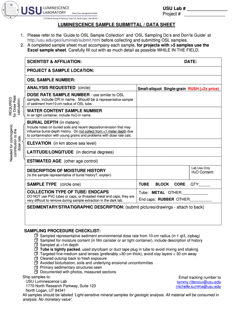 USU Lab Project LUMINESCENCE SAMPLE SUBMITTAL / DATA SHEET 1. Please refer to the Guide to OSL Sample Collection and OSL Sampling Do s and Don ts Guide at http //usu.edu/geo/luminlab/submit. Rittenour usu.edu 1770 North Research Parkway Suite 123 michelle. summa usu.edu North Logan UT 84341 All samples should be labeled Light-sensitive mineral samples for geologic analysis. Should be a representative sample of sediment from10-cm radius of OSL tube. WATER CONTENT SAMPLE NUMBER In air tight...