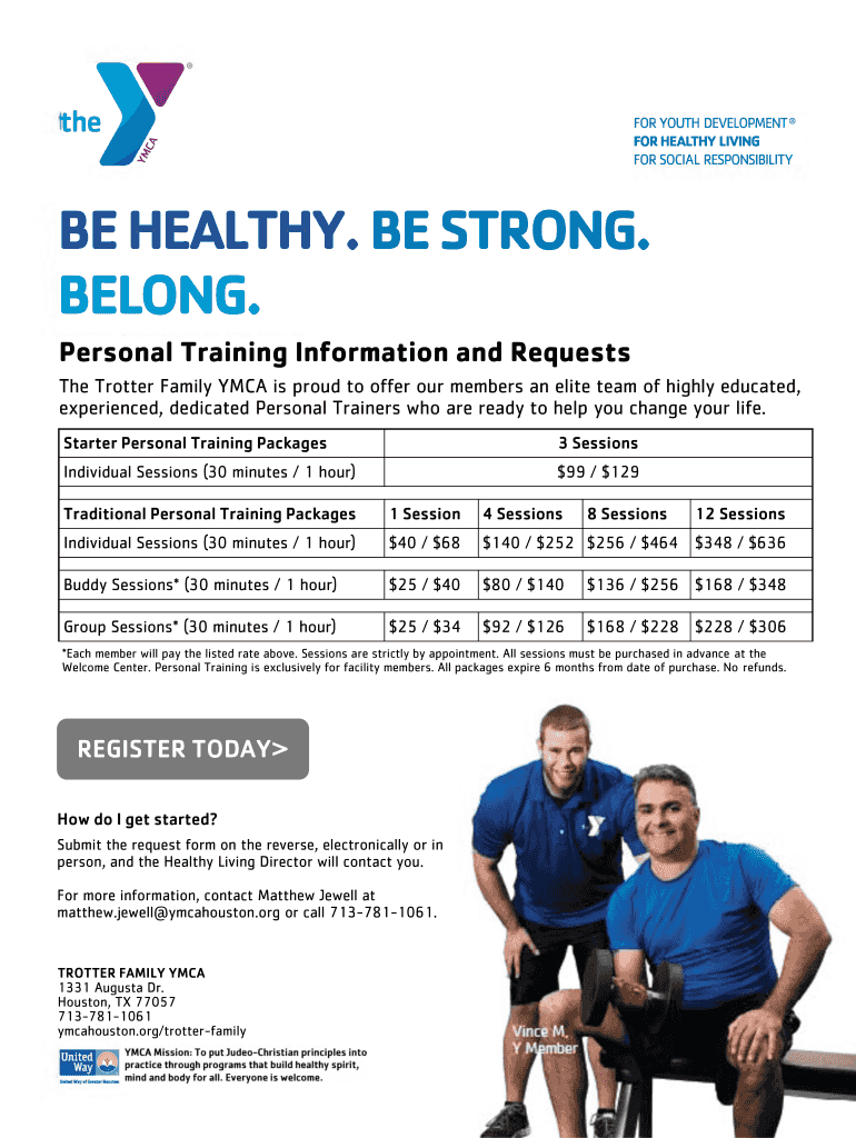For more information contact Matthew Jewell at matthew. jewell ymcahouston.org or call 713-781-1061. TROTTER FAMILY YMCA 1331 Augusta Dr. Houston TX 77057 713-781-1061 ymcahouston.org/trotter-family Private Client Request Form Today s Date Name Age Email Contact Number Select one 1 1 Buddy Group for Nutrition Pilates Yoga Preferred day s Monday Tuesday Wednesday Thursday Friday Saturday Sunday Preferred time s Other Information goals activities current health and abilities etc. If...