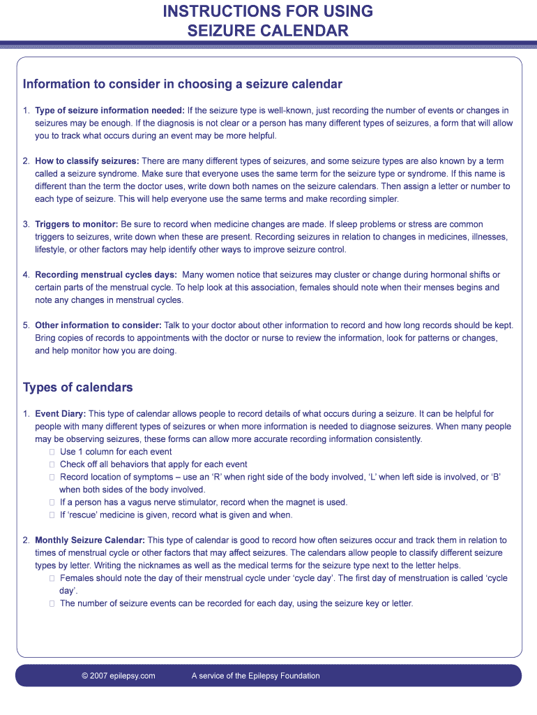 Recording menstrual cycles days Many women notice that seizures may cluster or change during hormonal shifts or certain parts of the menstrual cycle. To help look at this association females should note when their menses begins and note any changes in menstrual cycles. It can be helpful for people with many different types of seizures or when more information is needed to diagnose seizures. How to classify seizures There are many different types of seizures and some seizure types are also...