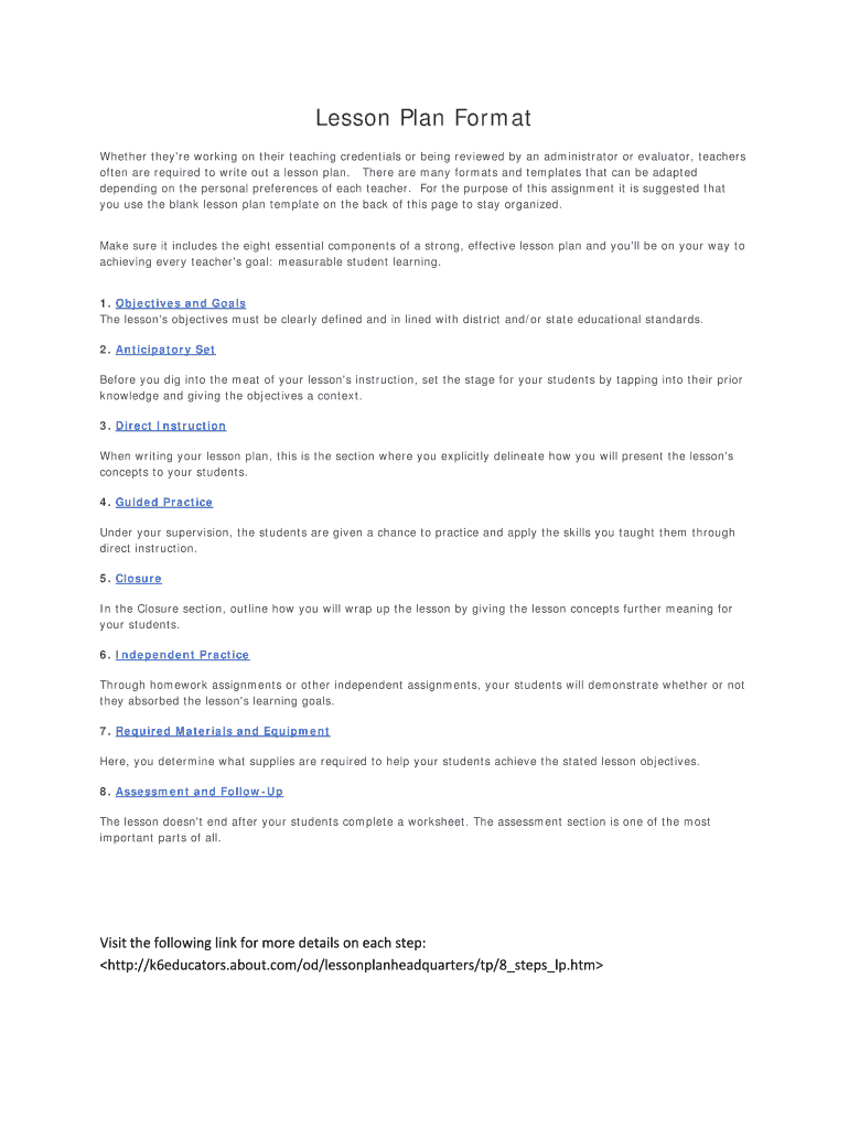 About. com/od/lessonplanheadquarters/tp/8stepslp.htm 8-Step Lesson Plan Template Be very specific as to exactly what you will be doing each minute the period. Lesson Plan Format Whether they re working on their teaching credentials or being reviewed by an administrator or evaluator teachers often are required to write out a lesson plan. There are many formats and templates that can be adapted depending on the personal preferences of each teacher. 1. Objectives and Goals The lesson s...