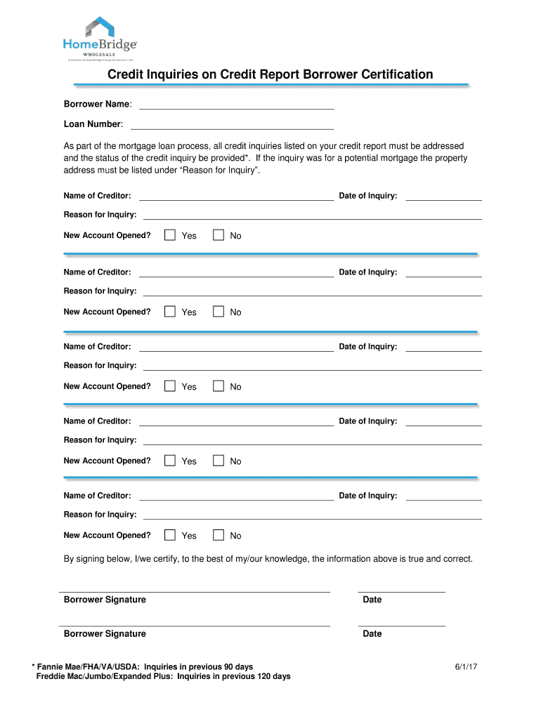 Borrower Signature Date Fannie Mae/FHA/VA/USDA Inquiries in previous 90 days Freddie Mac/Jumbo/Expanded Plus Inquiries in previous 120 days 6/1/17. Credit Inquiries on Credit Report Borrower Certification Borrower Name Loan Number As part of the mortgage loan process all credit inquiries listed on your credit report must be addressed and the status of the credit inquiry be provided. If the inquiry was for a potential mortgage the property address must be listed under Reason for Inquiry. Name...
