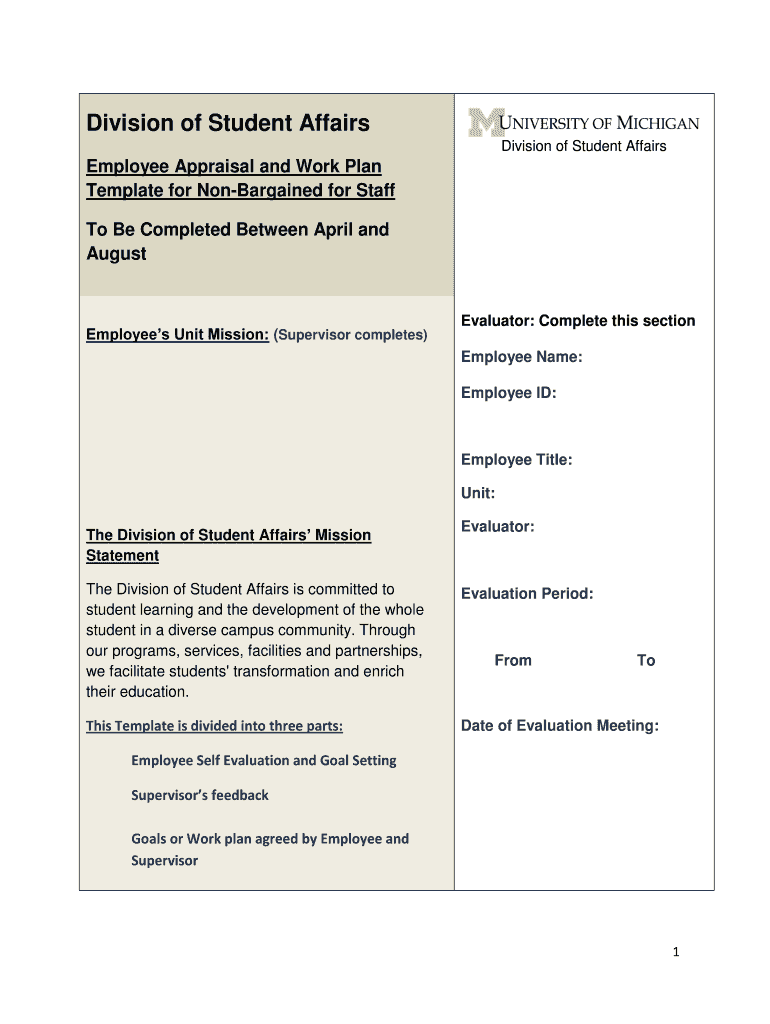 Additional documentation may be found at http //www. umich. edu/ dsafinhr GOAL Unit/Org Goal Important Milestones/ Action Steps How Measured Due Date mm/dd/yy Comments Signatures do not necessarily imply agreement with all information included above but indicate that the appraisal has been received read and discussed. If the employee wishes to provide additional response to the evaluation please attach comments on a separate document. Umich. edu/ dsafinhr/performance. html Overall Feedback...