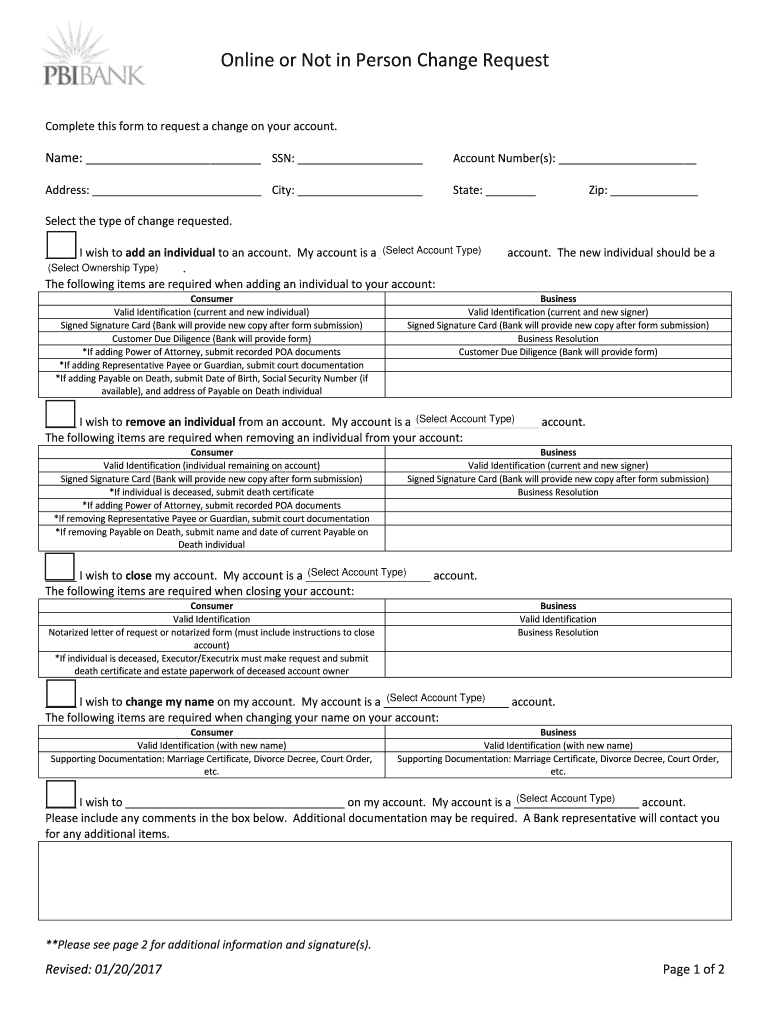 Please see page 2 for additional information and signature s. Revised 01/20/2017 Page 1 of 2 Submit all required items to one of the following Mail PBI Bank Attn Maintenance Request PO Box 436029 Louisville KY 40253 E-mail id pbibank. Of Transportation FAA Pilots License Foreign Driver s License I authorize the changes to my account as indicated on this request Customer Signature Date Notary Account Closures only County of Subscribed sworn and acknowledged to before me by on this day of as...