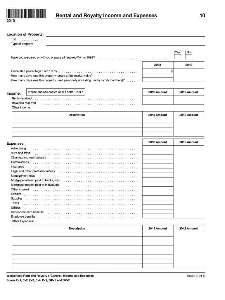 Rental and Royalty Income and Expenses 10 2013 Location of Property: TSA Type of property Yes Have you prepared, or will you prepare all required Forms 1099? 2013 Ownership percentage if not 100%