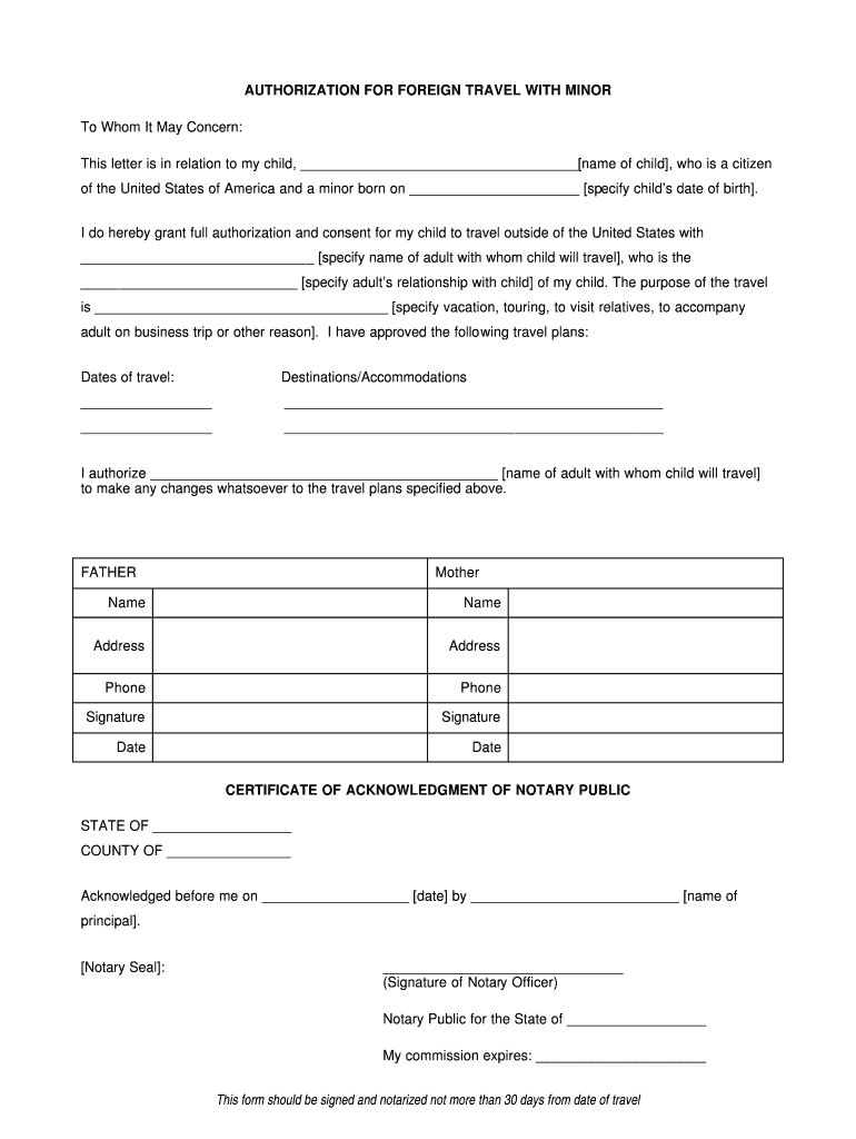 Get the free Authorization for Foreign Travel with Minor