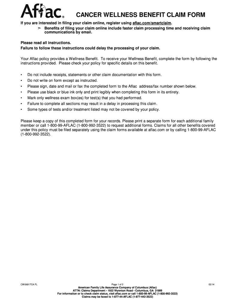CW06917CA FL Page 1 of 2 American Family Life Assurance Company of Columbus Aflac ATTN Claims Department 1932 Wynnton Road Columbus GA 31999 For information or to check claim status visit aflac.com or call 1-800-99-AFLAC 1-800-992-3522 Claims may be faxed to 1-877-44-AFLAC 1-877-442-3522 02/14 Policy Number Policyholder Information All Fields are required. Last Name Suffix Date of Birth mm/dd/yy / First Name MI Telephone Number where we can reach you - Home Address City State Zip Code Check...