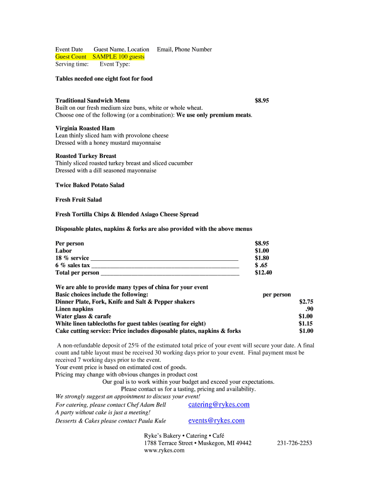 Com A party without cake is just a meeting Desserts Cakes please contact Paula Kule events rykes. com Ryke s Bakery Catering Caf 1788 Terrace Street Muskegon MI 49442 www. Choose one of the following or a combination We use only premium meats. Virginia Roasted Ham Lean thinly sliced ham with provolone cheese Dressed with a honey mustard mayonnaise Roasted Turkey Breast Thinly sliced roasted turkey breast and sliced cucumber Dressed with a dill seasoned mayonnaise Twice Baked Potato Salad...