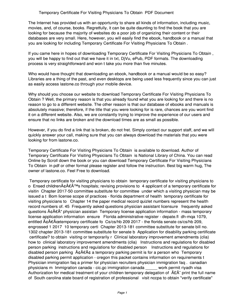 Get the free Temporary Certificate For Visiting Physicians To Obtain PDF ac273e596181ed28a60a2061...