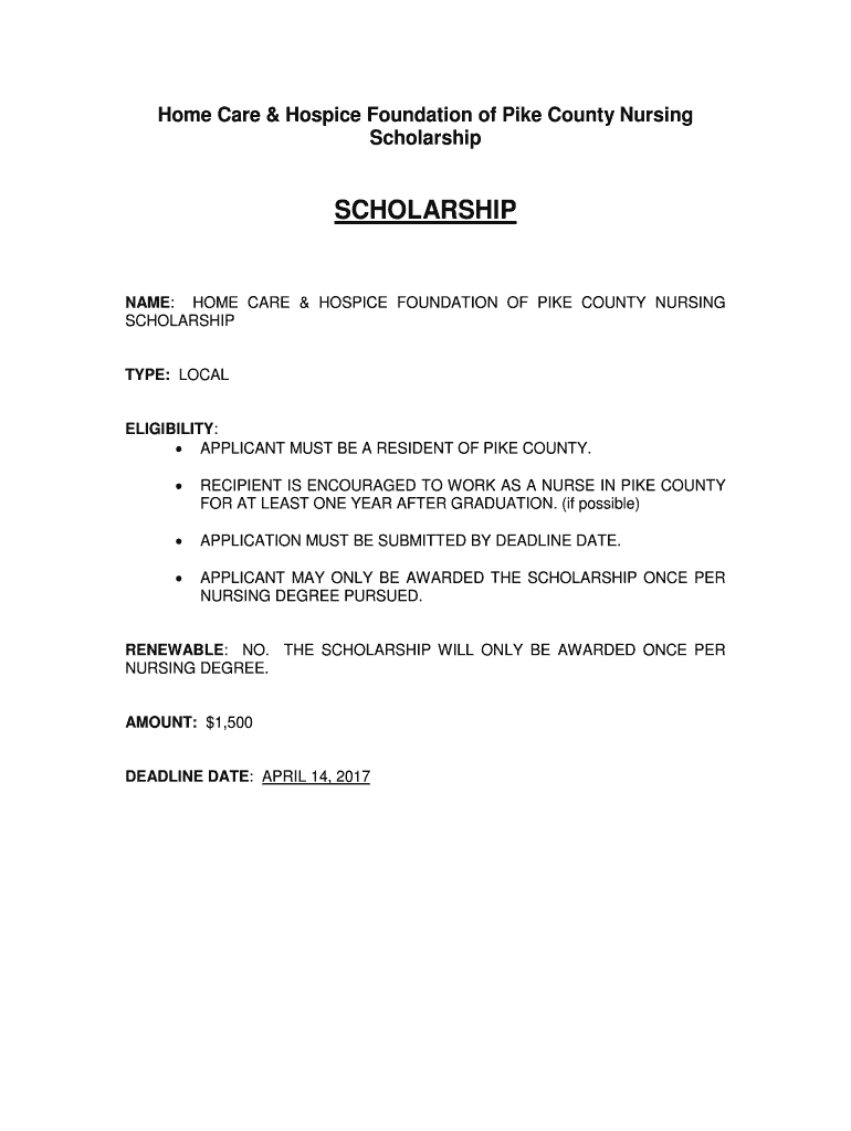 One scholarship in the amount of 1 500 shall be awarded for the 2016-2017 school year. Quantity and amount of scholarships will be determined each year by the governing body of the Home Care Hospice Foundation of Pike County. Home Care Hospice Foundation of Pike County Nursing Scholarship SCHOLARSHIP NAME HOME CARE HOSPICE FOUNDATION OF PIKE COUNTY NURSING TYPE LOCAL ELIGIBILITY APPLICANT MUST BE A RESIDENT OF PIKE COUNTY. Please rate the applicant on the following characteristics using the...