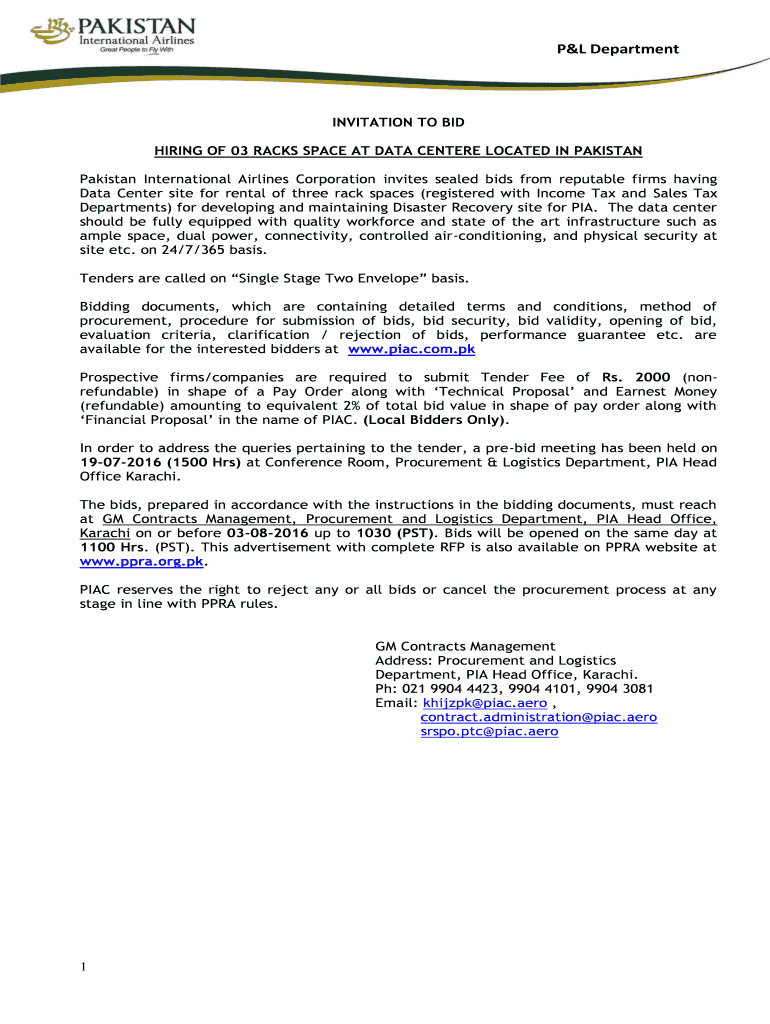Ppra.org. pk. PIAC reserves the right to reject any or all bids or cancel the procurement process at any stage in line with PPRA rules. 22 Annexure I - Part B Data Centre Demographics. 24 ANNEXURE II - Format for Bidders Information. 27 Annexure III Compliance for Qualification Criteria. 20 8. 14 GOVERING LAW AND DISPUTES. 20 OTHER CONDITIONS. 20 ANNEXURE I -Part A - Technical requirements. 9 SCOPE OF WORK. 10 3. 1 RELIABILITY UPTIME. 10 3. 2 INCIDENTAL SERVICES. 11 3. 3 TOTAL COST OF...