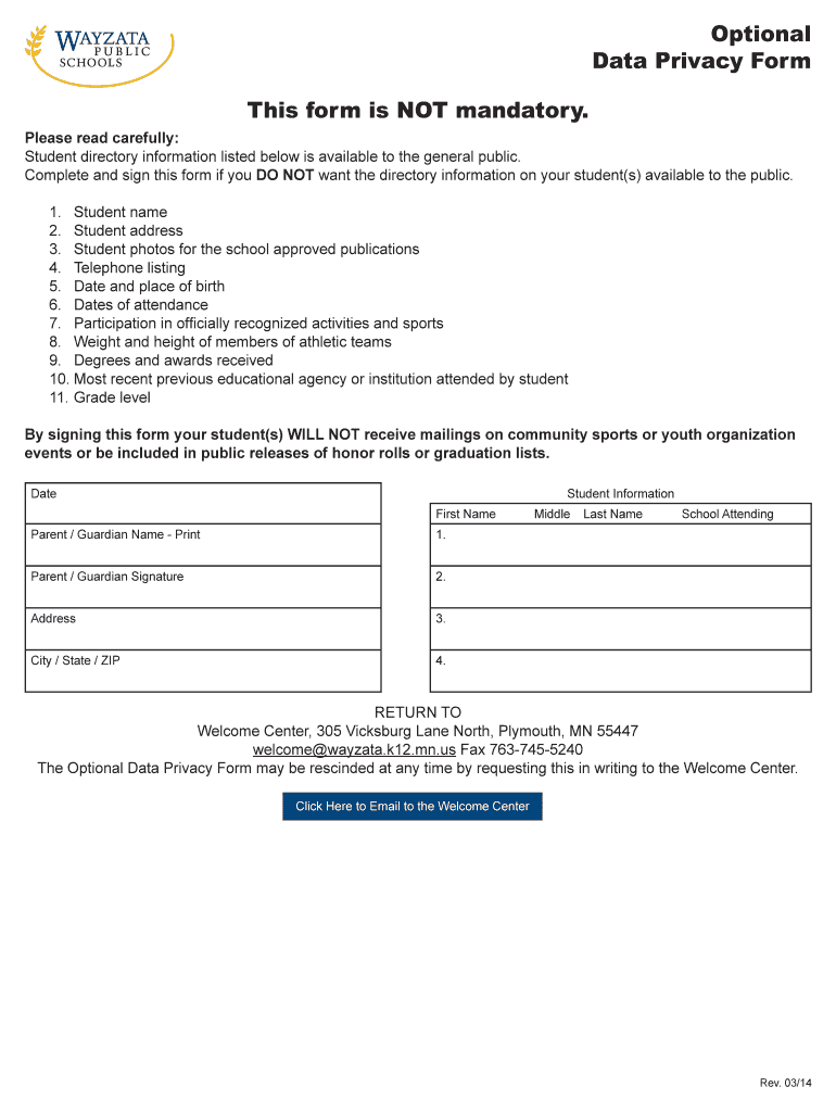 The form can be completed by parents or guardians of students attending schools in Minnesota who wish to prevent their child's directory information from being publicized.