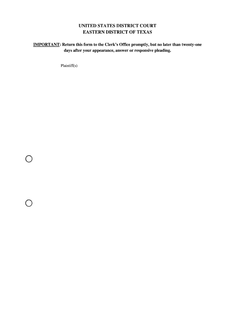 This form is also available from the court s website txed.uscourts. gov. Although the court encourages consent you are free to withhold consent without adverse consequences. If any party declines the case will be reassigned to a district judge for any dispositive matters and/or trial but will remain with the magistrate judge for all pretrial matters. UNITED STATES DISTRICT COURT EASTERN DISTRICT OF TEXAS NOTICE OF ASSIGNMENT OF CASE TO A UNITED STATES MAGISTRATE JUDGE Pursuant to General...