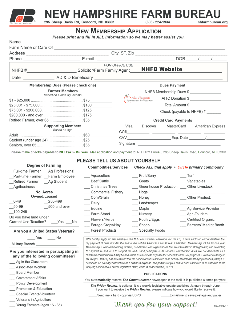 NEW HAMPSHIRE FARM BUREAU 295 Sheep Davis Rd Concord NH 03301 603 224-1934 nhfarmbureau. org New Membership Application Please print and fill in ALL information so we may better assist you. Name Farm Name or Care Of Address City ST Zip Phone E-mail DOB // FOR OFFICE USE NHFB Website NHFB Solicitor/Farm Family Agent Membership Dues Please check one Dues Payment Farmer Members NHFB Membership Dues Based on Gross Ag Income AITC Donation 1 - 25 000. The portions of your annual dues estimated to...