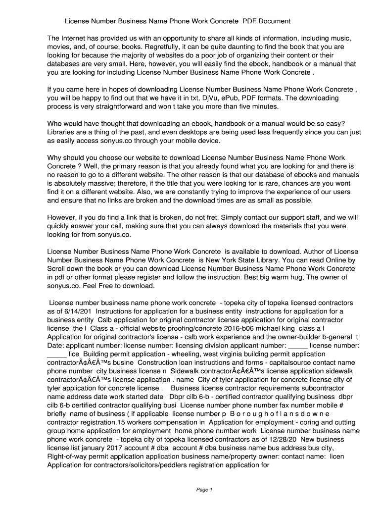 Get the free License Number Business Name Phone Work Concrete PDF 4279eec00e81313b6dbb967a383e128...