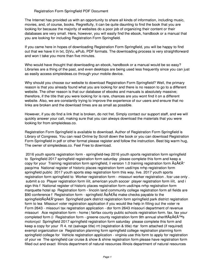 If you came here in hopes of downloading Registration Form Springfield you will be happy to find out that we have it in txt DjVu ePub PDF formats. 0 training registration form pacp/ma National register of historic places registration form usdi/nps nrhp registration form springfield public 2017 youth sports step registration form this way. Fax your completed form i Registration form - greene county registration form 9th annual sheriff s motorcycl Springfield 2017 springfield registration...