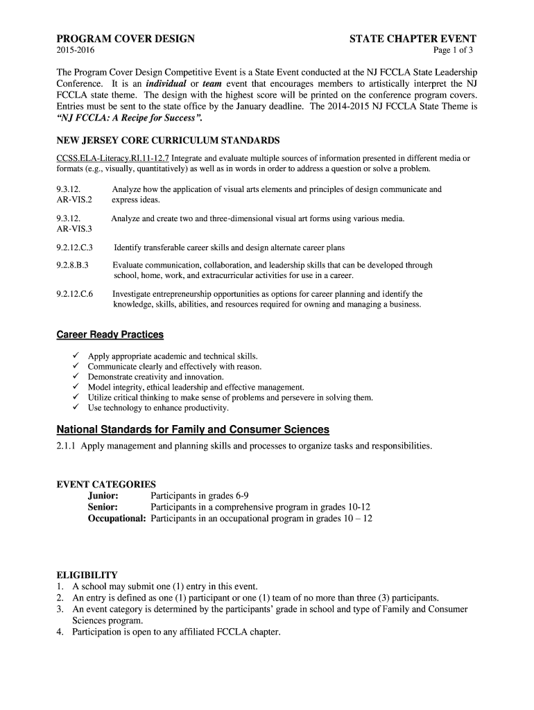 The 2014-2015 NJ FCCLA State Theme is NJ FCCLA A Recipe for Success. NEW JERSEY CORE CURRICULUM STANDARDS CCSS.ELA-Literacy. It is an individual or team event that encourages members to artistically interpret the NJ FCCLA state theme. The current FCCLA state theme NJ FCCLA A Recipe for Success written out B. month day s and year of the State Leadership Conference March 26-27 2015 C. PROGRAM COVER DESIGN STATE CHAPTER EVENT 2015-2016 Page 1 of 3 The Program Cover Design Competitive Event is...
