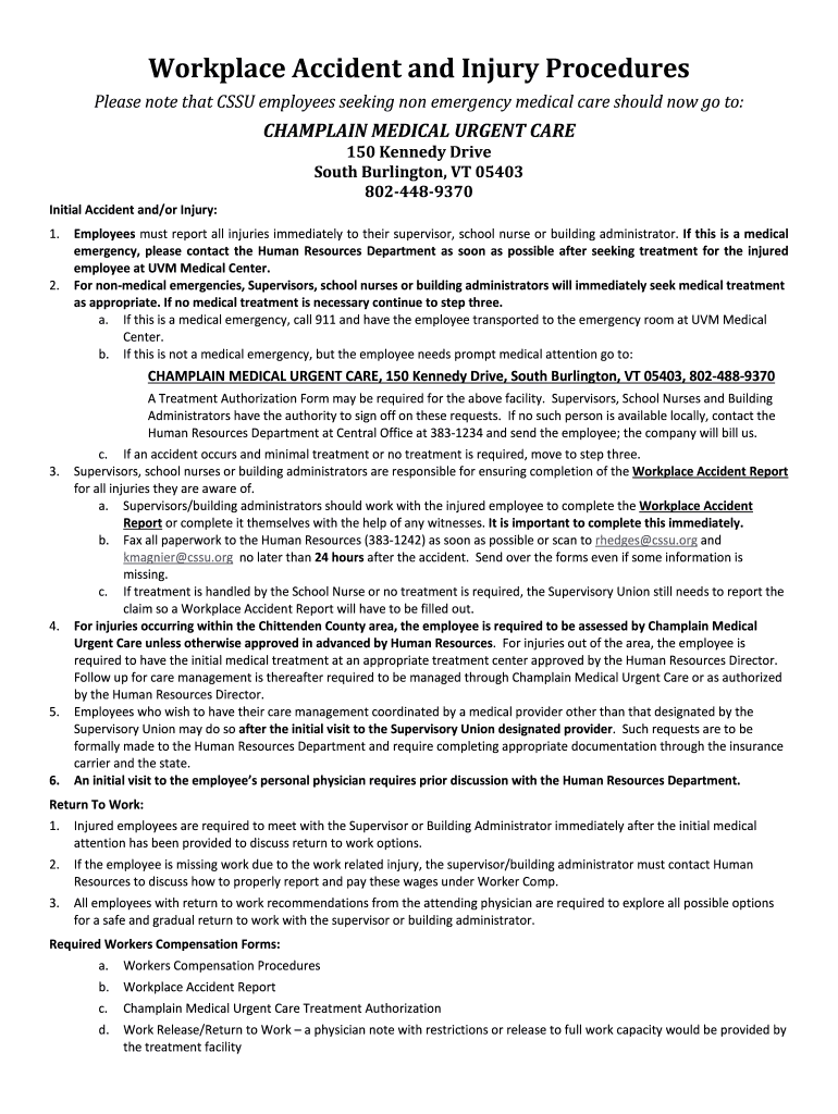 For injuries occurring within the Chittenden County area the employee is required to be assessed by Champlain Medical Urgent Care unless otherwise approved in advanced by Human Resources. Supervisors School Nurses and Building Administrators have the authority to sign off on these requests. For non-medical emergencies Supervisors school nurses or building administrators will immediately seek medical treatment as appropriate. What object or substance directly injured the employee For example...
