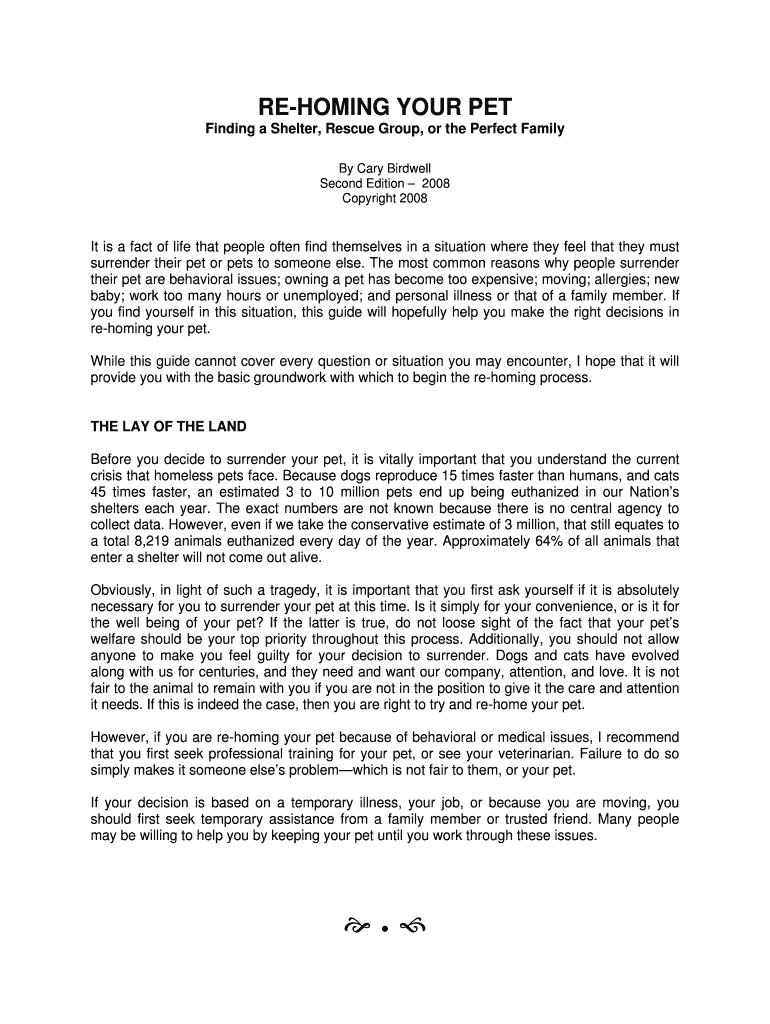 RE-HOMING YOUR PET Finding a Shelter, Rescue Group, or the Perfect Family By Cary Bird well Second Edition 2008 Copyright 2008 It is a fact of life that people often find themselves in a situation