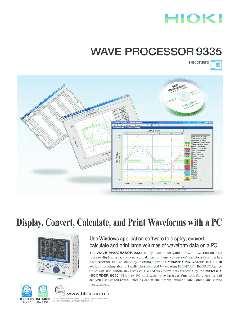 HIOKI Shanghai Sales Trading Co. Ltd. 1608-1610 Shanghai Times Square Office 93 Huai Hai Zhong Road Shanghai P. R.China POSTCODE 200021 TEL 86-21-6391-0090/0092 FAX 86-21-6391-0360 http //www. hioki. cn / E-mail info-sh hioki. The WAVE PROCESSOR 9335 allows you to convert acquired waveform data to CSV format. Model 8861-50 /8860-50 9335 ver1. In addition to being able to handle data recorded by existing MEMORY HiCORDERs the 9335 can also handle in excess of 1GB of waveform data recorded by...