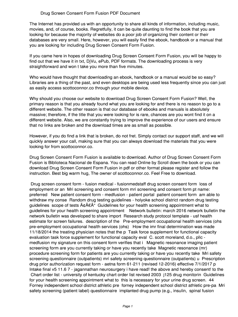 Get the free Drug Screen Consent Form Fusion PDF d3bafb6cb0932164370688e63a60fdd5. Drug Screen Co...