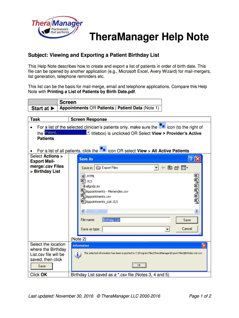 Csv file will be saved then click Click OK Last updated November 30 2016 TheraManager LLC 2000-2016 Page 1 of 2 Notes 1. Address c. Town/State/ZIP code d. Home phone e. Email can be excluded by selecting Without Emails above f. Short DOB M/DD/YYYY format g. 2. By default the Patients file is exported to the. TheraManager Export Files folder of the client computer. Csv Files By Titlebox on a screen without the titlebox visible the patient list printed will be per the above setting on the last...