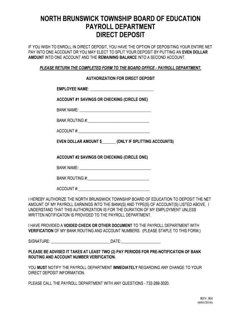 I HAVE PROVIDED A VOIDED CHECK OR OTHER DOCUMENT TO THE PAYROLL DEPARTMENT WITH VERIFICATION OF MY BANK ROUTING AND ACCOUNT NUMBERS. PLEASE STAPLE TO THIS FORM. NORTH BRUNSWICK TOWNSHIP BOARD OF EDUCATION PAYROLL DEPARTMENT DIRECT DEPOSIT IF YOU WISH TO ENROLL IN DIRECT DEPOSIT YOU HAVE THE OPTION OF DEPOSITING YOUR ENTIRE NET PAY INTO ONE ACCOUNT OR YOU MAY ELECT TO SPLIT YOUR DEPOSIT BY PUTTING AN EVEN DOLLAR AMOUNT INTO ONE ACCOUNT AND THE REMAINING BALANCE INTO A SECOND ACCOUNT. SIGNATURE...