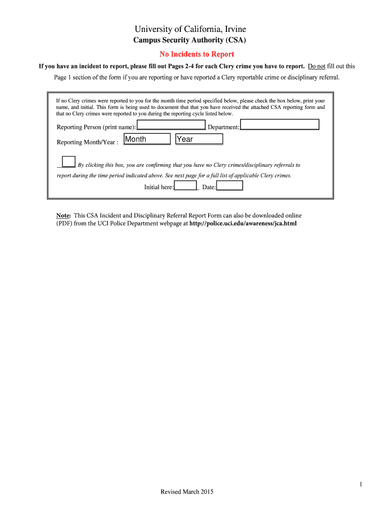 When in doubt about any CSA crime or disciplinary referral incident report simply include additional incident information or contact Chris Seide Clery Act Compliance Coordinator for assistance at cseide uci. Uci. edu/awareness/jca.html Revised March 2015 Incident and Disciplinary Referral Report Form Please complete all information sections and mark applicable selection boxes. See next page for a full list of applicable Clery crimes. Initial here Date Note This CSA Incident and Disciplinary...