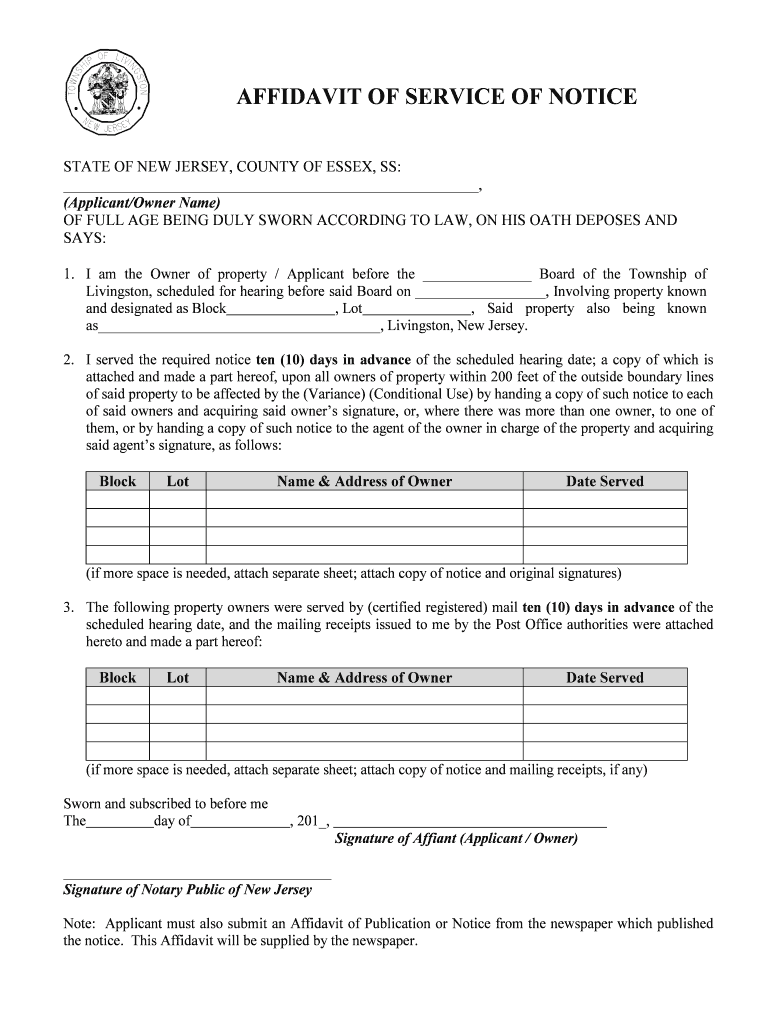 AFFIDAVIT OF SERVICE OF NOTICE STATE OF NEW JERSEY, COUNTY OF ESSEX, SS:, (Applicant/Owner Name) OF FULL AGE BEING DULY SWORN ACCORDING TO LAW, ON HIS OATH DEPOSES AND SAYS: 1. I am the Owner of property