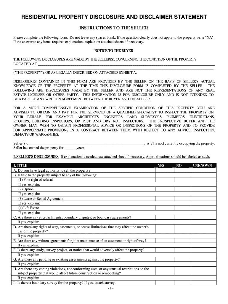 RESIDENTIAL PROPERTY DISCLOSURE AND DISCLAIMER STATEMENT INSTRUCTIONS TO THE SELLER Please complete the following form. Do not leave any spaces blank. If the question clearly does not apply to the