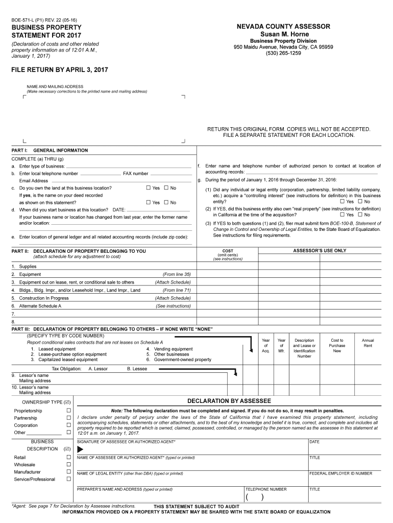 SIGNATURE OF ASSESSEE OR AUTHORIZED AGENT R Year of Mfr. DECLARATION BY ASSESSEE OWNERSHIP TYPE R Proprietorship Acq. BOE-571-L P1 REV. 22 05-16 NEVADA COUNTY ASSESSOR Susan M. Horne BUSINESS PROPERTY STATEMENT FOR 2017 Business Property Division 950 Maidu Avenue Nevada City CA 95959 530 265-1259 Declaration of costs and other related property information as of 12 01 A. In the case of a Limited Liability Company LLC the declaration must be signed by an LLC manager or by a member where there...