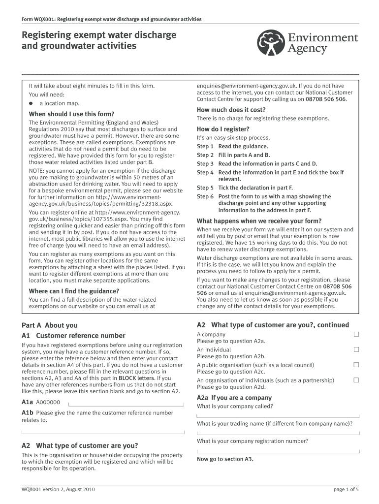 General enquiries 08708 506 506 Monday to Friday 8am to 6pm Textphone 08702 422 549 Monday to Friday 8am to 6pm Email enquiries environment-agency. If you do not have a customer reference number please fill in the relevant questions in sections A2 A3 and A4 of this part in BLOCK letters. National grid reference B1a Are the exemptions on a farm Please tick one of the boxes below Yes No B2 Details of exempt water discharge and groundwater activities either a new discharge one first made on or...