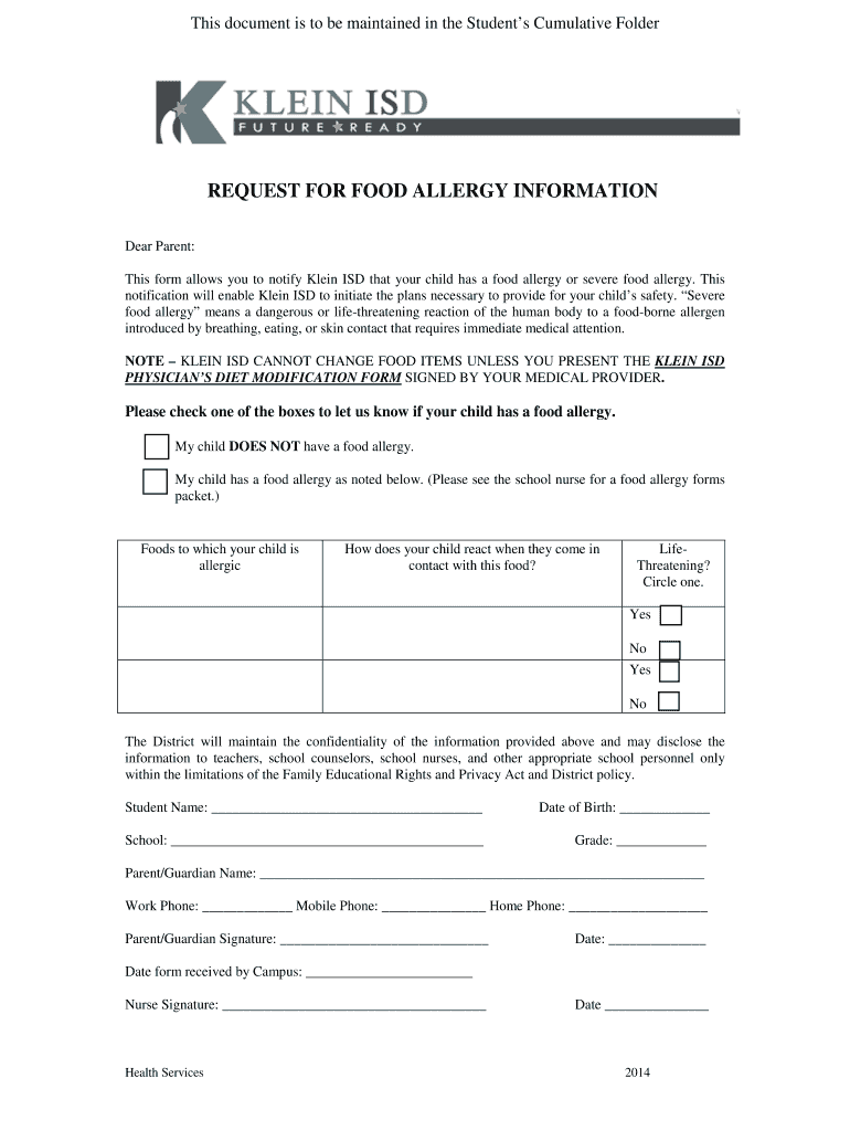 This notification will enable Klein ISD to initiate the plans necessary to provide for your child s safety. This document is to be maintained in the Student s Cumulative Folder Reset Form REQUEST FOR FOOD ALLERGY INFORMATION Dear Parent This form allows you to notify Klein ISD that your child has a food allergy or severe food allergy. Severe food allergy means a dangerous or life-threatening reaction of the human body to a food-borne allergen introduced by breathing eating or skin contact...