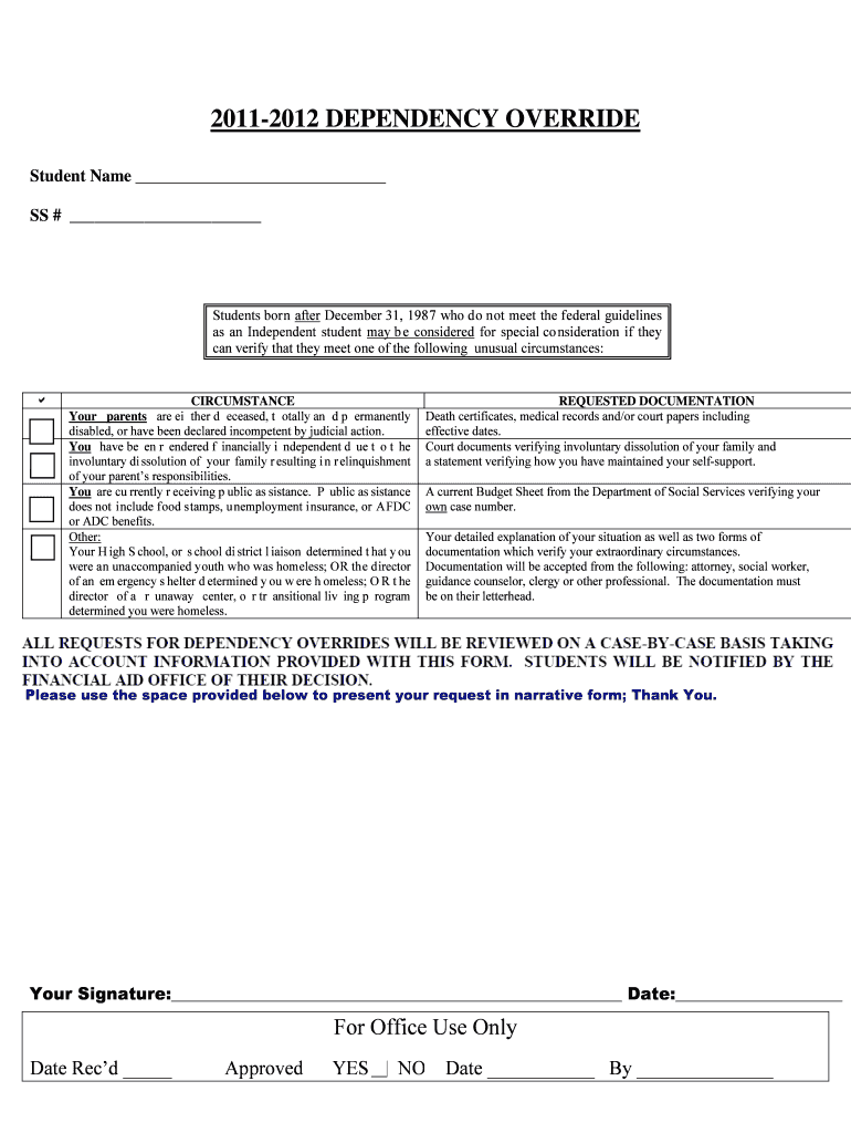 The Dependency Override Form is an education document used by students to request special consideration for independent status based on unusual circumstances.