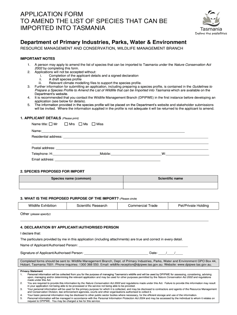 APPLICATION FORM TO AMEND THE LIST OF SPECIES THAT CAN BE IMPORTED INTO TASMANIA Department of Primary Industries, Parks, Water & Environment RESOURCE MANAGEMENT AND CONSERVATION, WILDLIFE MANAGEMENT