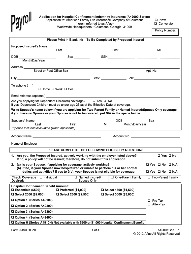 It does not pay your Medicare deductibles or coinsurance and is not a substitute for Medicare Supplement insurance. Check Coverage Desired Individual Named Insured/ Spouse Only Hospital Confinement Benefit Amount Essentials 500 Preferred 1 000 Select 2000 2 000 One-Parent Family Yes No N/A Two-Parent Family Select 1500 1 500 Option 1 Series A49100 Pre-Tax After-Tax Form A49001GcIL 1 of 4 A49001GcXIL.1 2012 Aflac All Rights Reserved Billing Method Payroll Deduction Employer Paid Bank...