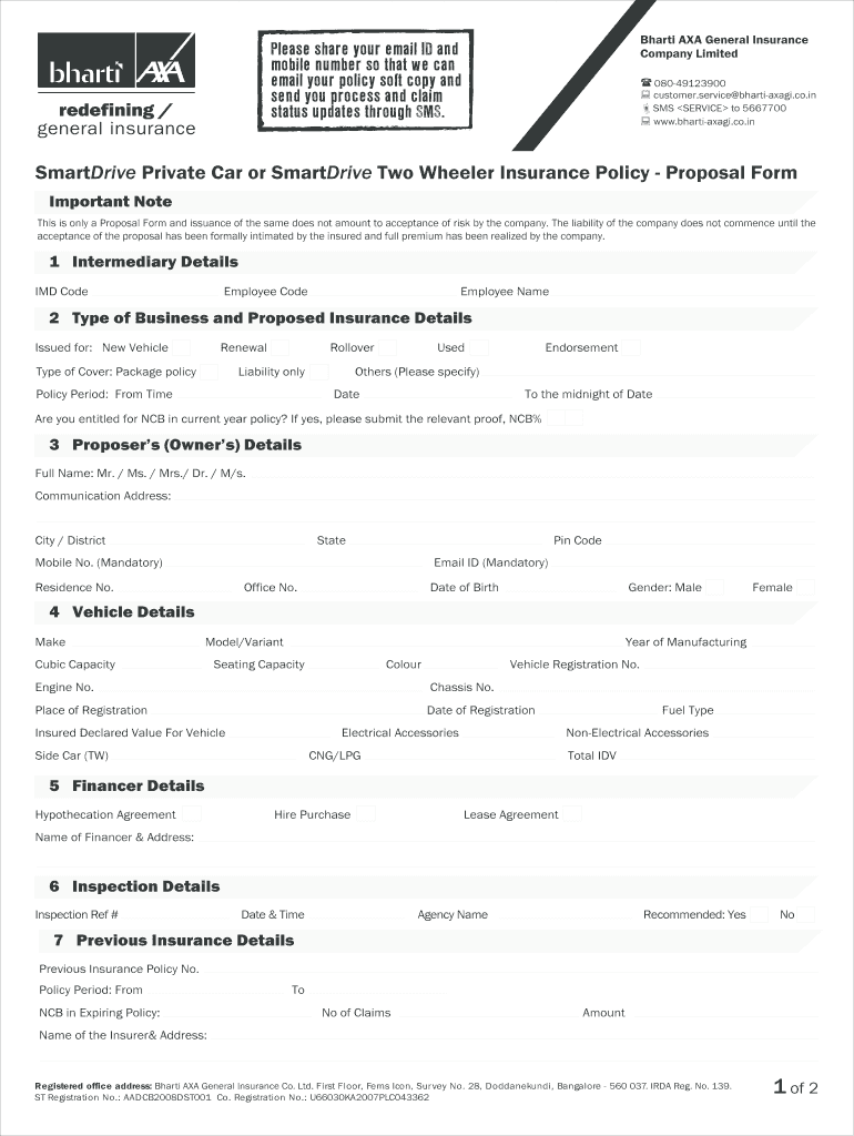Ltd. First Floor Ferns Icon Survey No. 28 Doddanekundi Bangalore - 560 037. IRDA Reg. No. 139. ST Registration No. AADCB2008DST001 Co. Service bharti-axagi. co. in SMS SERVICE to 5667700 www. bharti-axagi. co. in SmartDrive Private Car or SmartDrive Two Wheeler Insurance Policy - Proposal Form Important Note This is only a Proposal Form and issuance of the same does not amount to acceptance of risk by the company. Bharti AXA General Insurance Company Limited Please share your email ID and...