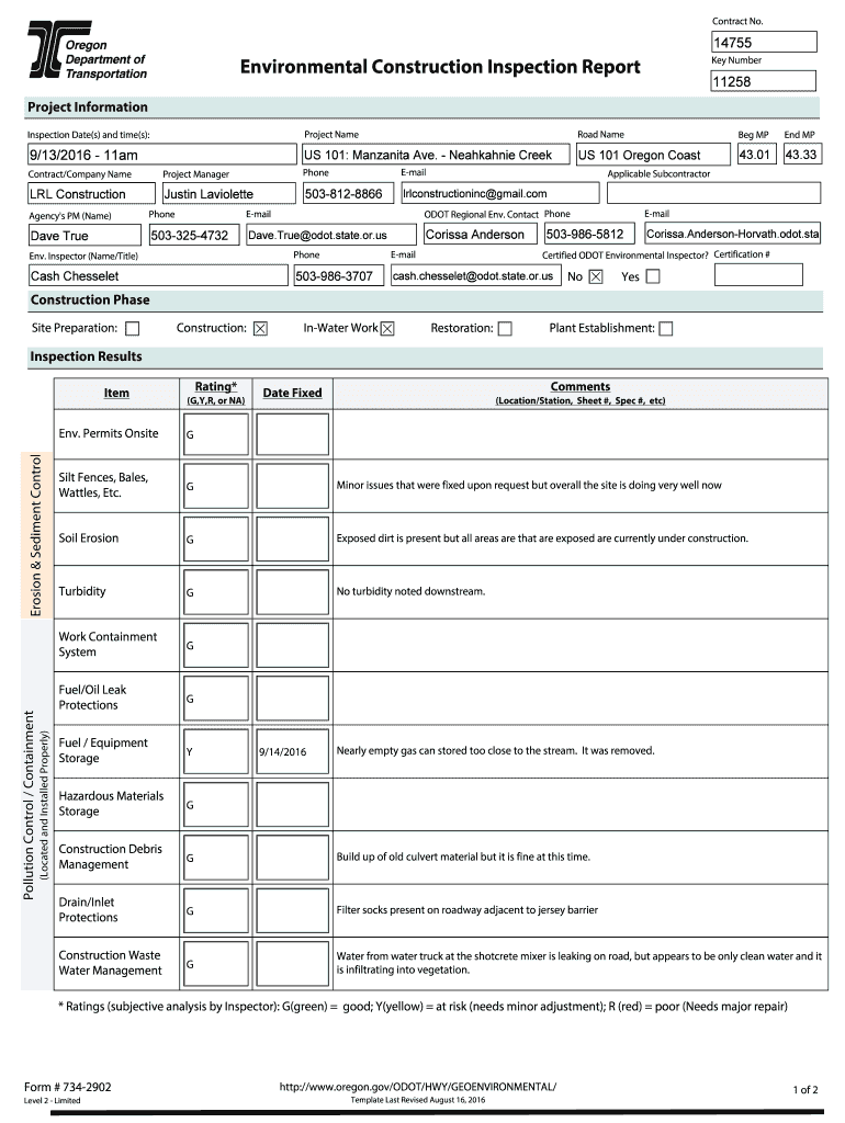 True odot. state. or. us Corissa Anderson 503-986-5812 Certified ODOT Environmental Inspector Certification Env. Inspector Name/Title Cash Chesselet 503-986-3707 cash. - Neahkahnie Creek Contract/Company Name Project Manager Phone E-mail LRL Construction Justin Laviolette 503-812-8866 lrlconstructioninc gmail.com Road Name Beg MP End MP US 101 Oregon Coast 43. Oregon.gov/ODOT/HWY/GEOENVIRONMENTAL/ Template Last Revised August 16 2016 1 of 2 Wetland NA Stream / Riparian Protected Plants...