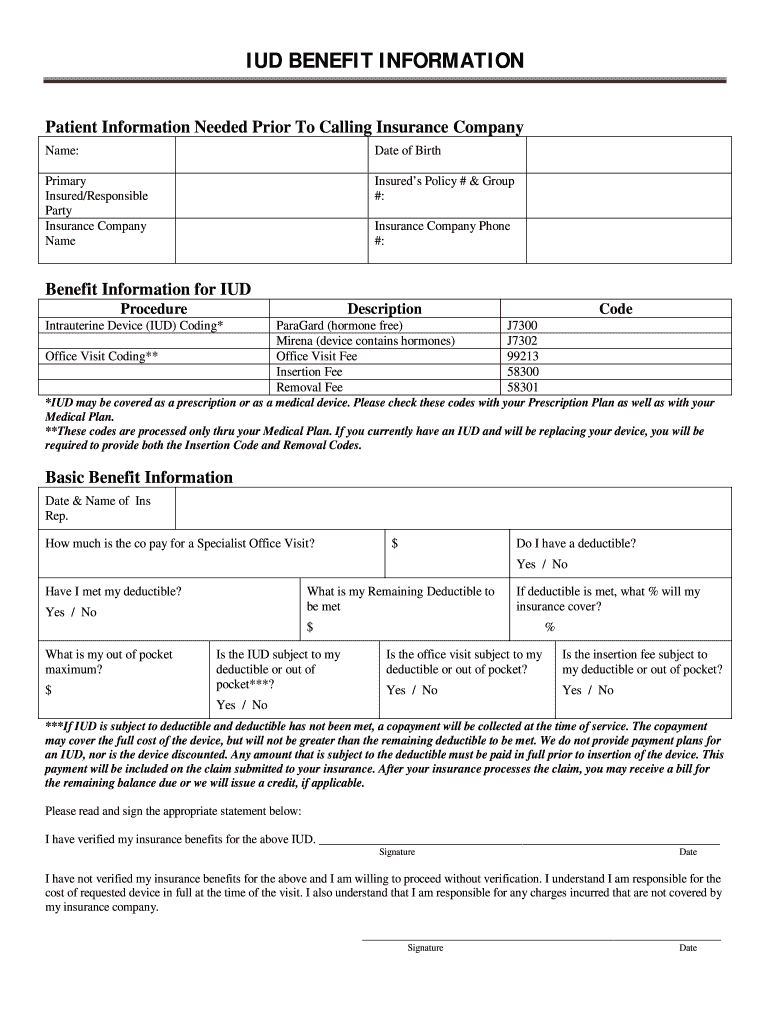 IUD BENEFIT INFORMATION Patient Information Needed Prior To Calling Insurance Company Name Date of Birth Primary Insured/Responsible Party Insurance Company Insured s Policy Group Benefit Information for IUD Procedure Description Code Intrauterine Device IUD Coding hormone free J7300 device contains hormones J7302 Office Visit Coding Office Visit Fee 99213 Insertion Fee 58300 Removal Fee 58301 IUD may be covered as a prescription or as a medical device. Please check these codes with your...