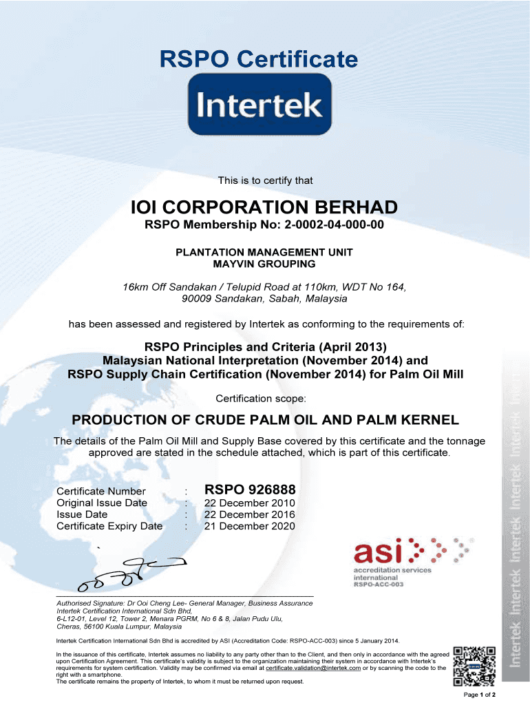 329 N 117 13. 532 E Mayvin 1 Estate WDT No 164 90009 Sandakan Sabah 5 34. 91 N 117 13. 277 E Mayvin 2/3 Estate Road WDT No 164 90009 Sandakan Sabah 5 33. Page 1 of 2 Certificate Schedule Certificate No. RSPO 926888 Palm Oil Mill and Supply base covered by the certificate are Name GPS Reference Address Latitude Longitude Mayvin POM Capacity 60 MT/hour Mayvin Palm Oil Mill Telupid 16km Off Sandakan/Telupid Road at 110 km WDT No 164 90009 Sandakan Sabah Malaysia 5 33. Certificate Number Original...