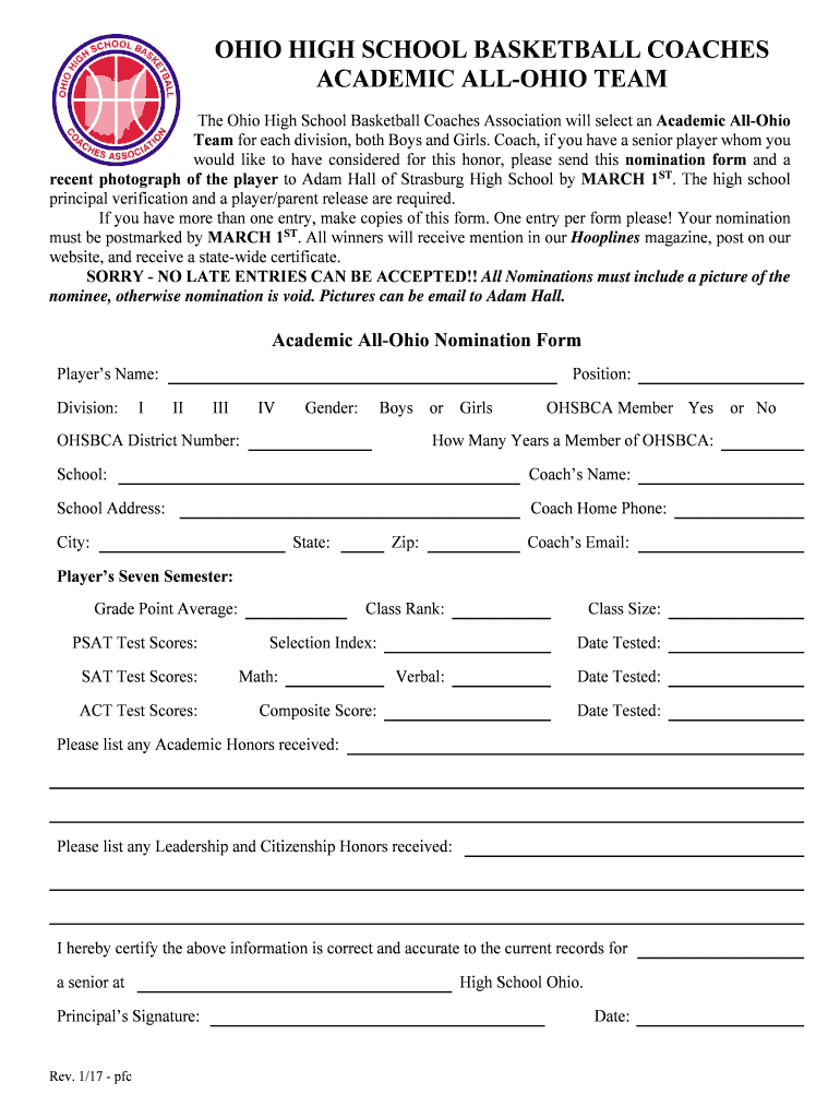 OHIO HIGH SCHOOL BASKETBALL COACHES ACADEMIC ALL-OHIO TEAM The Ohio High School Basketball Coaches Association will select an Academic All-Ohio Team for each division both Boys and Girls. All winners will receive mention in our Hooplines magazine post on our website and receive a state-wide certificate. SORRY - NO LATE ENTRIES CAN BE ACCEPTED All Nominations must include a picture of the nominee otherwise nomination is void. Pictures can be email to Adam Hall. Academic All-Ohio Nomination...