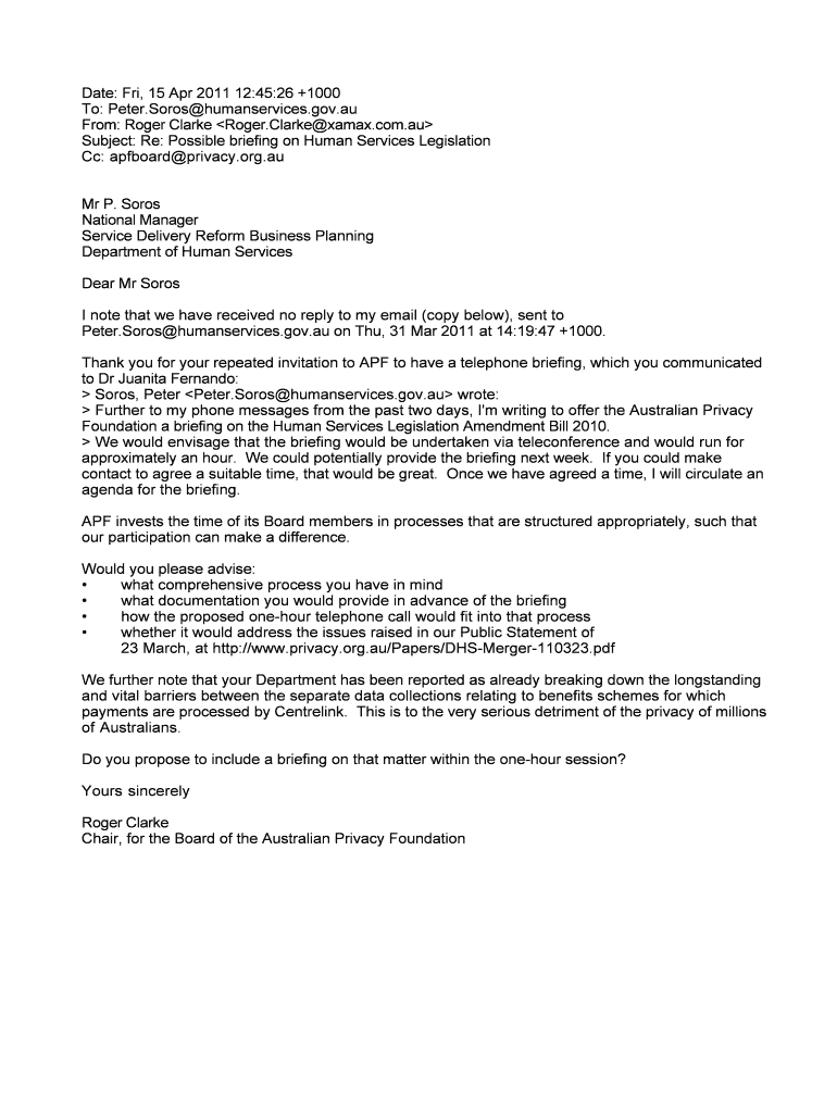 Date Fri 15 Apr 2011 12 45 26 1000 To Peter. Soros humanservices. gov.au From Roger Clarke Roger. Clarke xamax. Soros humanservices. gov.au wrote Further to my phone messages from the past two days I m writing to offer the Australian Privacy Foundation a briefing on the Human Services Legislation Amendment Bill 2010. Privacy. org. au/Papers/DHS-Merger-110323. pdf We further note that your Department has been reported as already breaking down the longstanding and vital barriers between the...