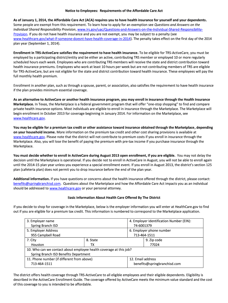Get the free Notice to Employees: Requirements of the Affordable Care Act As of ...