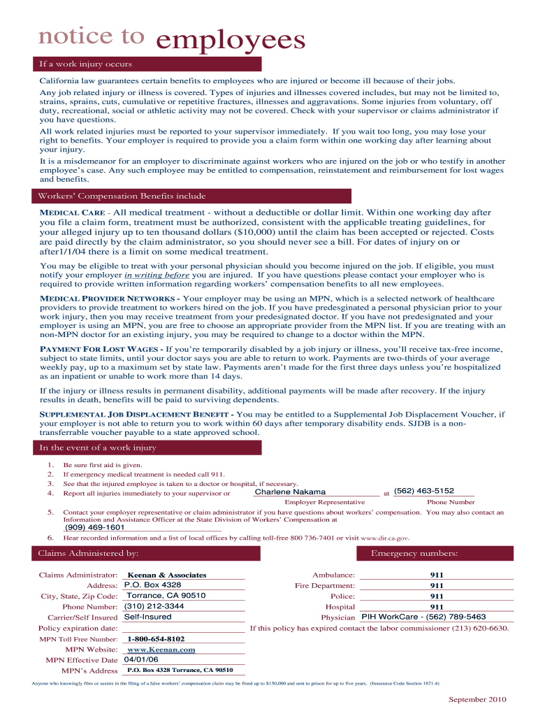 Notice to employees If a work injury occurs California law guarantees certain benefits to employees who are injured or become ill because of their jobs. Any job related injury or illness is covered.
