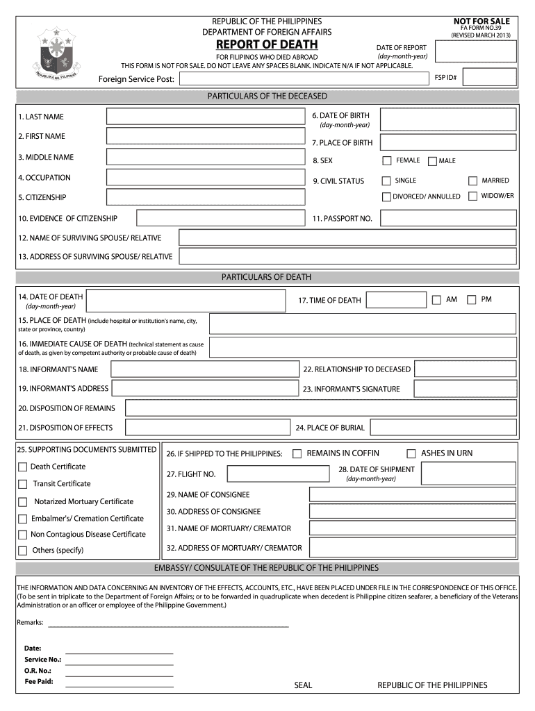 The Philippines Death Report Form, officially known as FA Form 39, plays a crucial role in the reporting of deaths of Filipinos who pass away abroad. This form is vital for ensuring that the death is officially recognized by the Philippine government, which is necessary for various legal and administrative purposes.