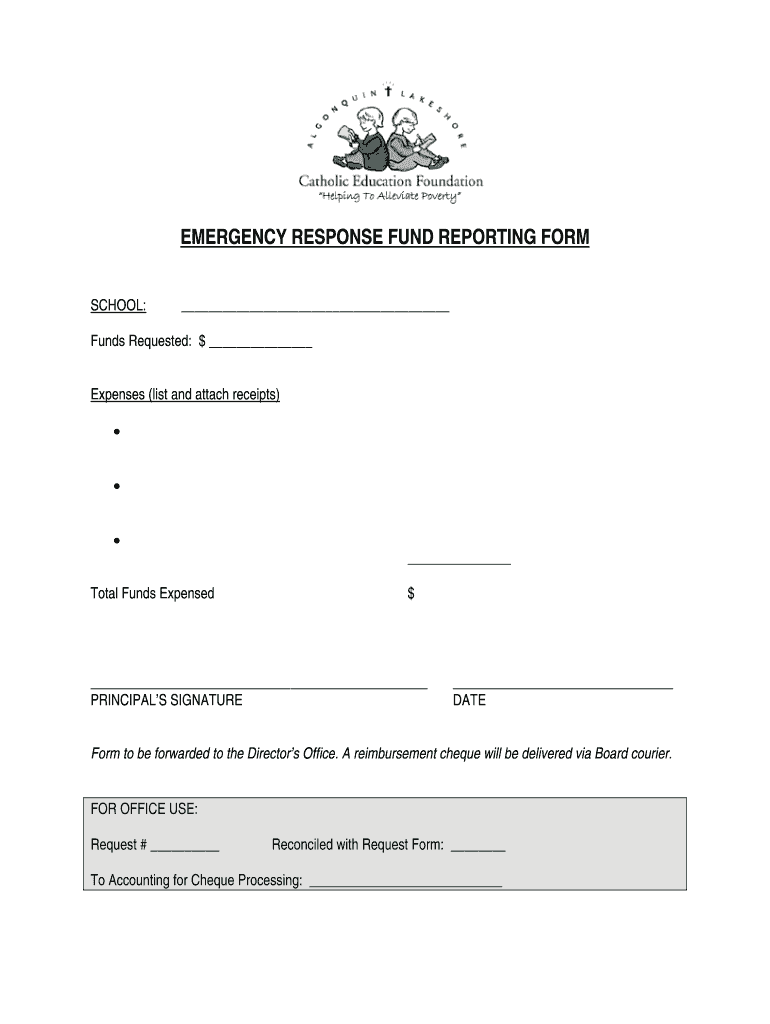 EMERGENCY RESPONSE FUND REPORTING FORM SCHOOL: Funds Requested: $ Expenses (list and attach receipts) Total Funds Expensed $ PRINCIPAL S SIGNATURE DATE Form to be forwarded to the Director s Office.